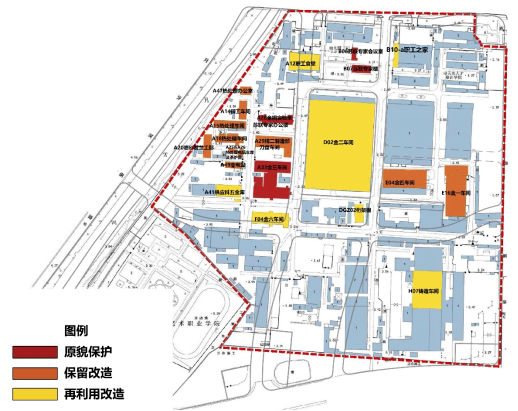 基于遺產價值定性認識和遺產價值定量評價,團隊對廠區百余棟建筑物、構筑物進行梳理與評分,確定需要重點保護和利用的建筑物、構筑物以及保護利用區和更新改造區,明確建筑保護利用類型。