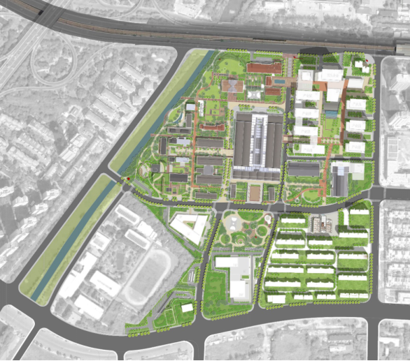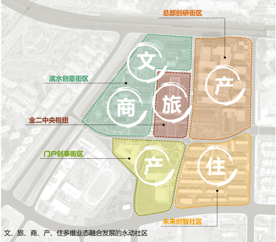 規劃打造“一心四坊、公園街區”的整體結構,以金二車間改造而成的中央樞紐作為片區核心,規劃“濱水創意街區、總部創研街區、門戶創享街區、未來創智社區”四大混合街坊,各街坊由連續舒適的街道體系串聯,共享開放的公共空間體系相互聯動,最終形成一個舒適好逛、無界復合的公園體驗街區。