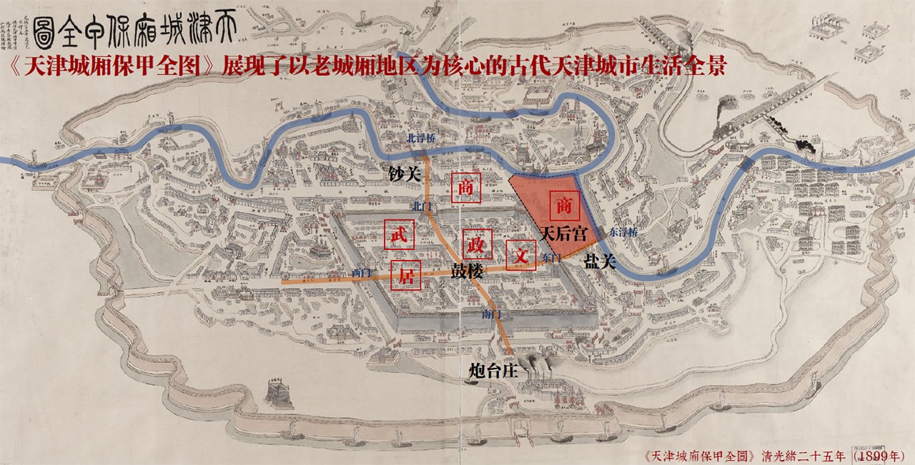 在本項(xiàng)目之前,天大設(shè)計(jì)總院完成了“老城廂—古文化街”片區(qū)城市更新概念規(guī)劃,以打造“中國(guó)北方運(yùn)河文化旅游休閑區(qū)、天津傳統(tǒng)文化開放式博物館群、海河津韻主題沉浸街區(qū)”為目標(biāo),以老城廂、古文化街兩個(gè)歷史文化街區(qū)的整體保護(hù)為基礎(chǔ),將兩個(gè)街區(qū)的多個(gè)特色歷史文化節(jié)點(diǎn)、南運(yùn)河和海河景觀串珠成鏈、連線成片,形成了“環(huán)游老城廂,一日六百年”的漫游體系。打造高品質(zhì)的生活空間,植入文旅產(chǎn)業(yè)運(yùn)營(yíng)體系,提供更多文旅融合精品和獨(dú)具魅力的文化旅游體驗(yàn)。