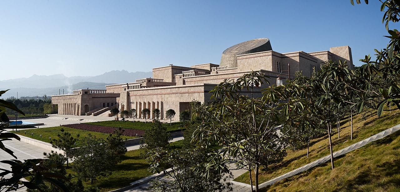由天大設(shè)計(jì)總院設(shè)計(jì)完成的寶雞市青銅器博物院建于寶雞市石鼓山風(fēng)景區(qū)內(nèi),總用地面積約5.08萬平方米,西靠石鼓山,東接茵湘河,背山面水,南臨301國道,地勢(shì)西高東低。