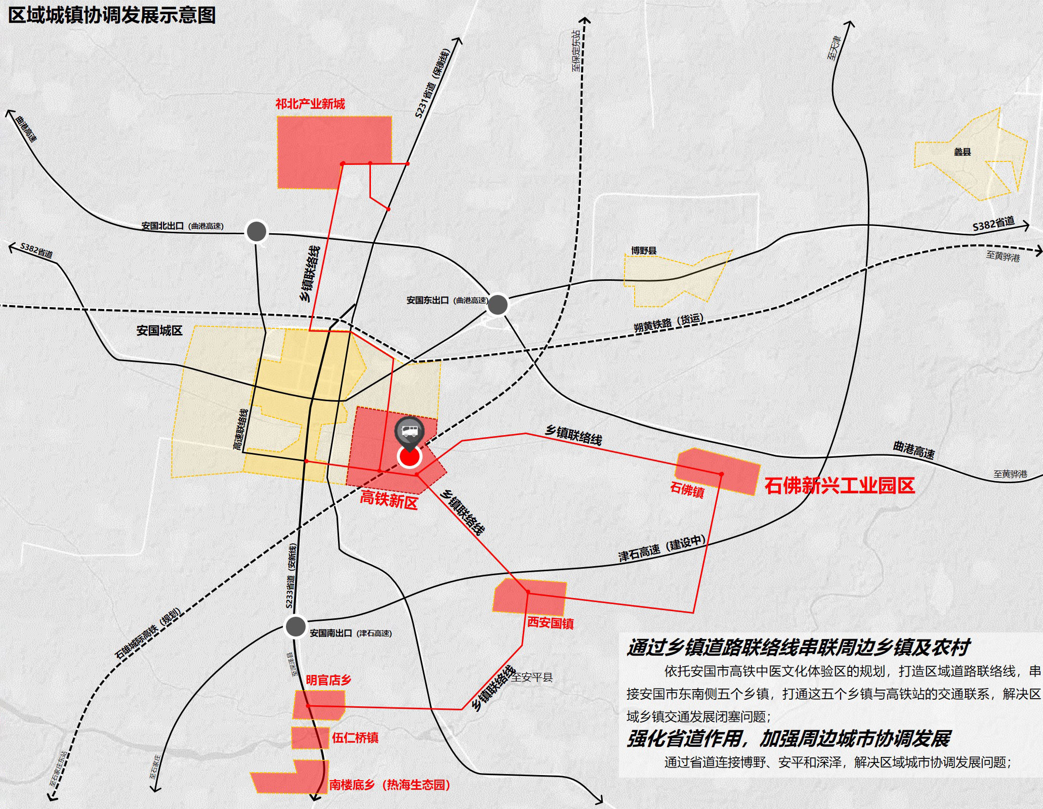 通過安國區域交通的體系梳理,強化便捷聯系中心城區、高鐵片區和祁北產業區的快速路體系。響應國家精準脫貧、鄉村振興的戰略,重點激活安國東南部五個鄉鎮(石佛鎮、西安國鎮、明官店鄉、伍仁橋鎮、南樓底鄉)的經濟發展;通過城鄉協調發展戰略帶動周邊鄉鎮(博野安平深澤)農業、工業、特色產業和服務業全面發展。