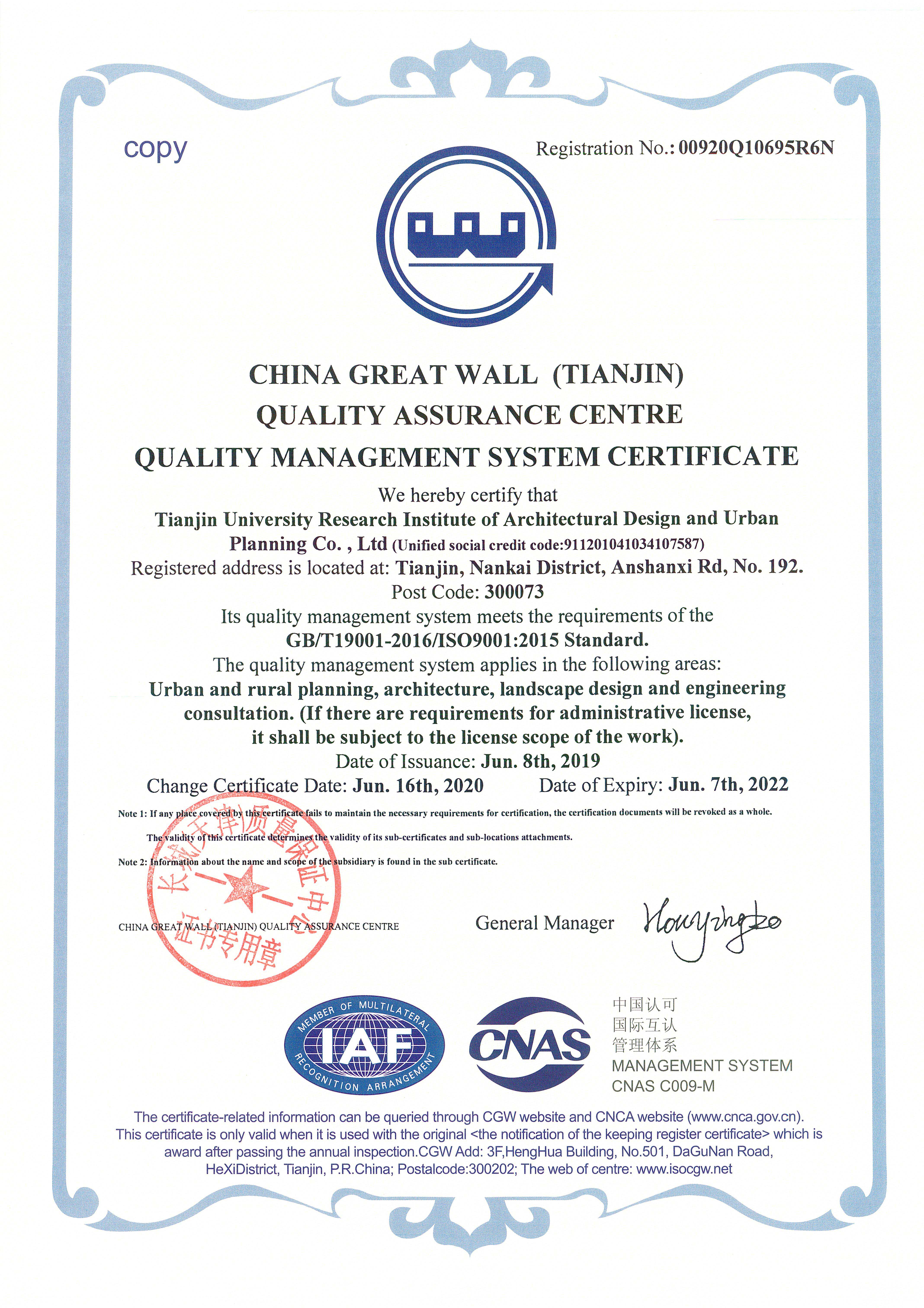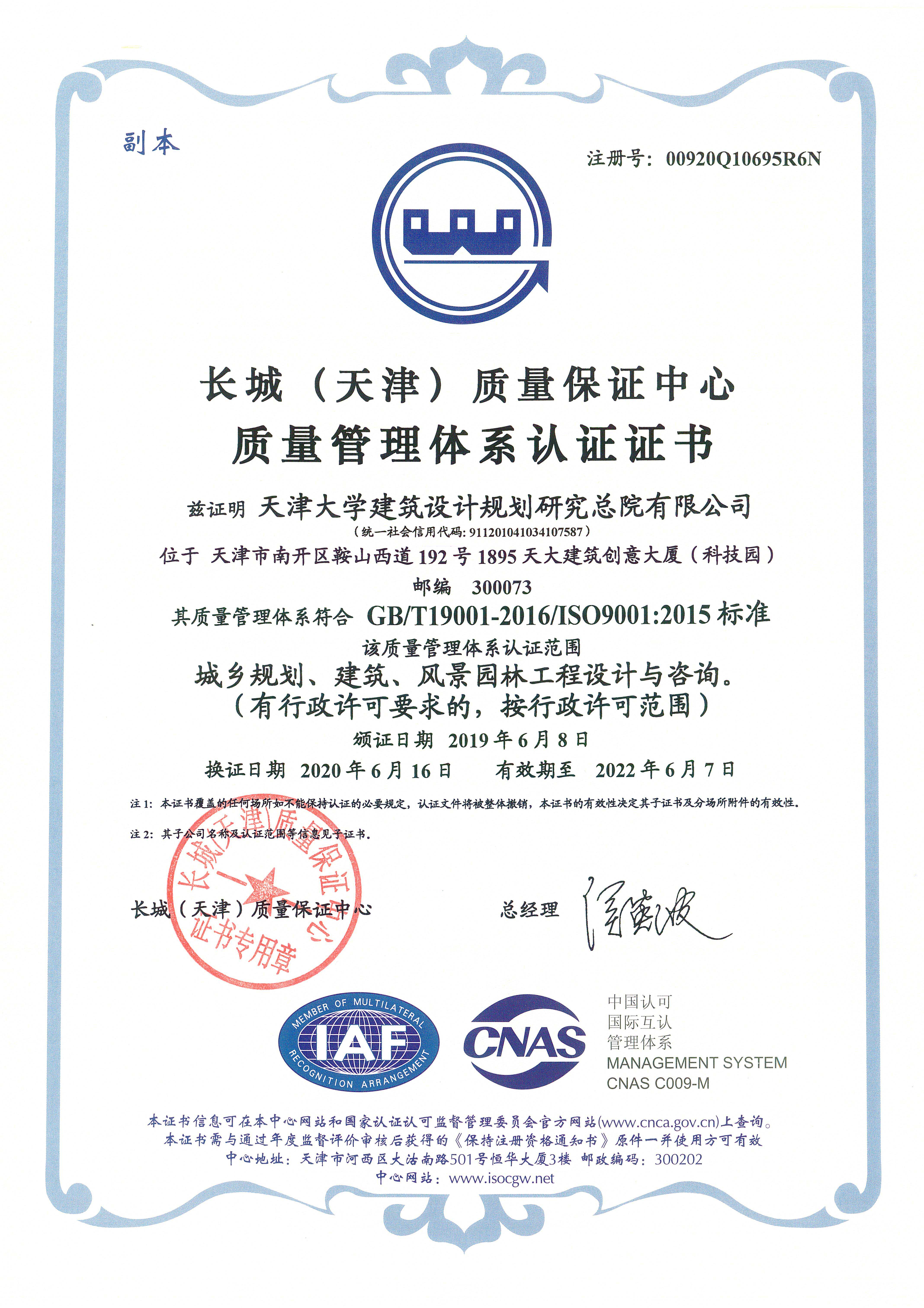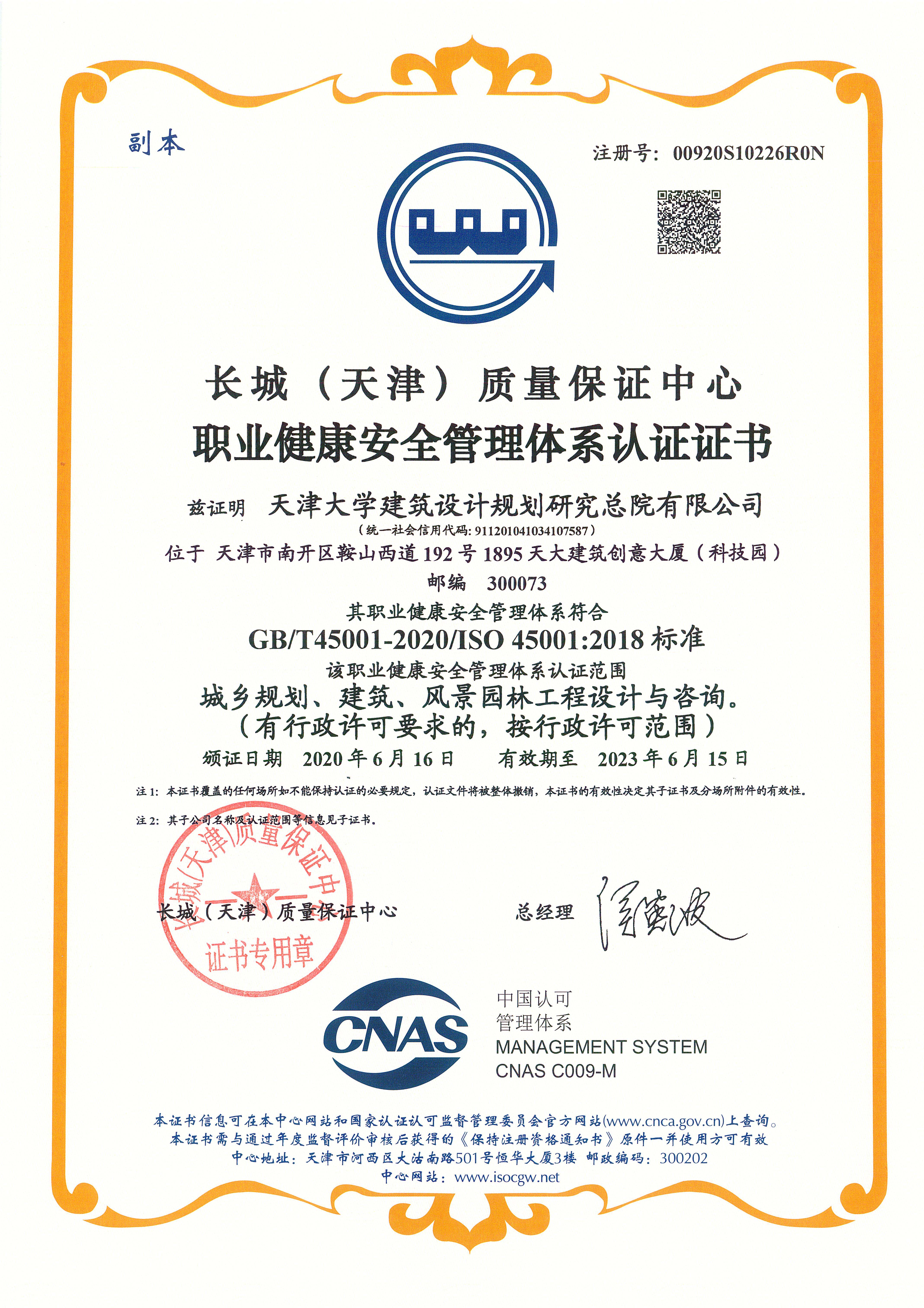 天津大學建筑設計規劃研究總院有限公司及天津大學城市規劃設計院有限公司獲得質量、環境、職業健康安全管理體系認證證書。