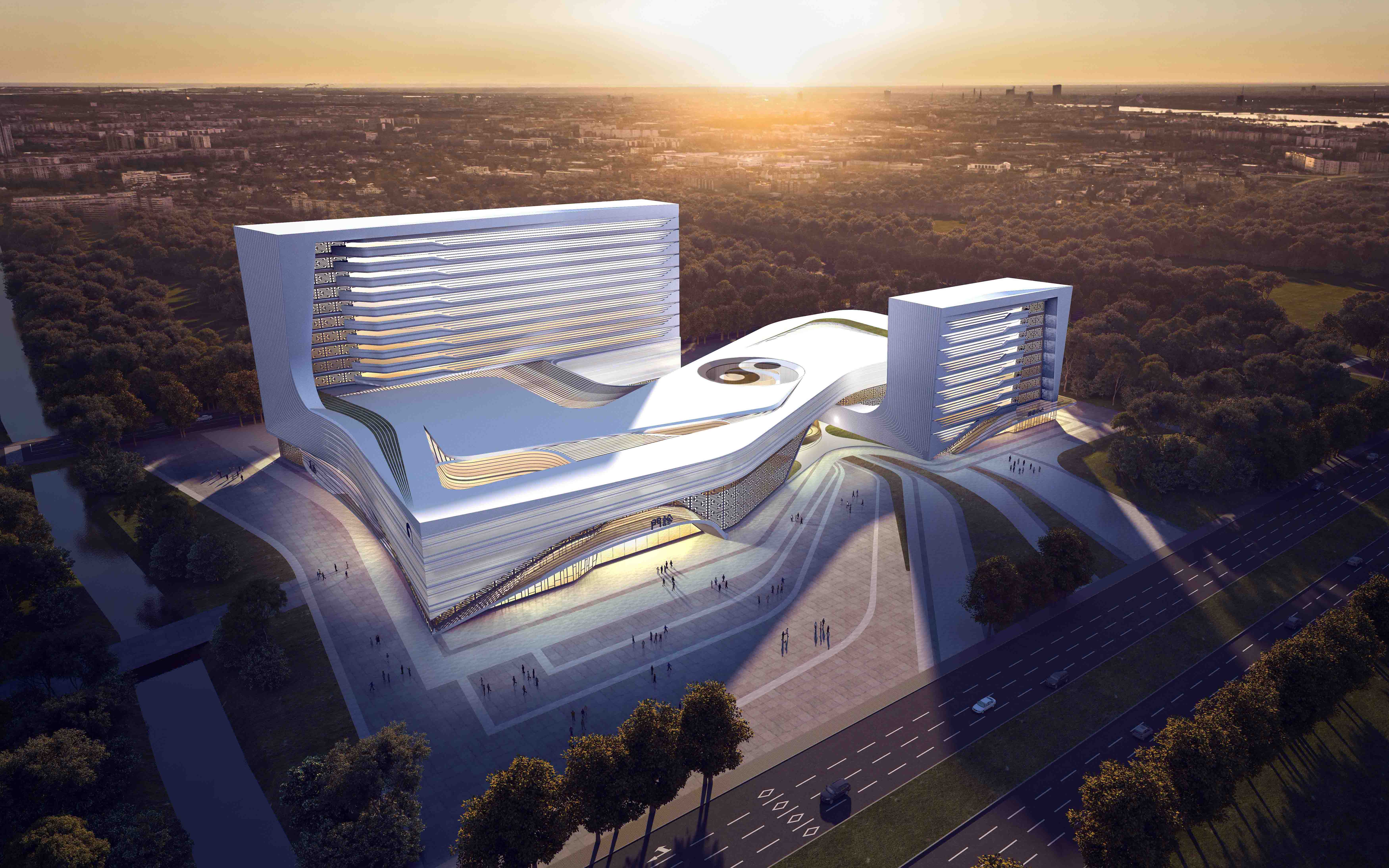 傳統中醫以陰陽五行學說和氣一元論為哲學基礎,以“天人相應”的整體觀為指導思想,形成一個辨證論治的醫學理論體系。我們從強調太極陰陽融合的中國中醫傳統智慧中汲取設計靈感,通過景觀醫療輔街串聯東西兩側城市景觀綠帶及院區內中醫文化廣場和生態花園,將建筑、景觀與周邊環境融為一體,為患者打造一個綠色健康、具有中醫文化特色的美好的“治愈的空間”。