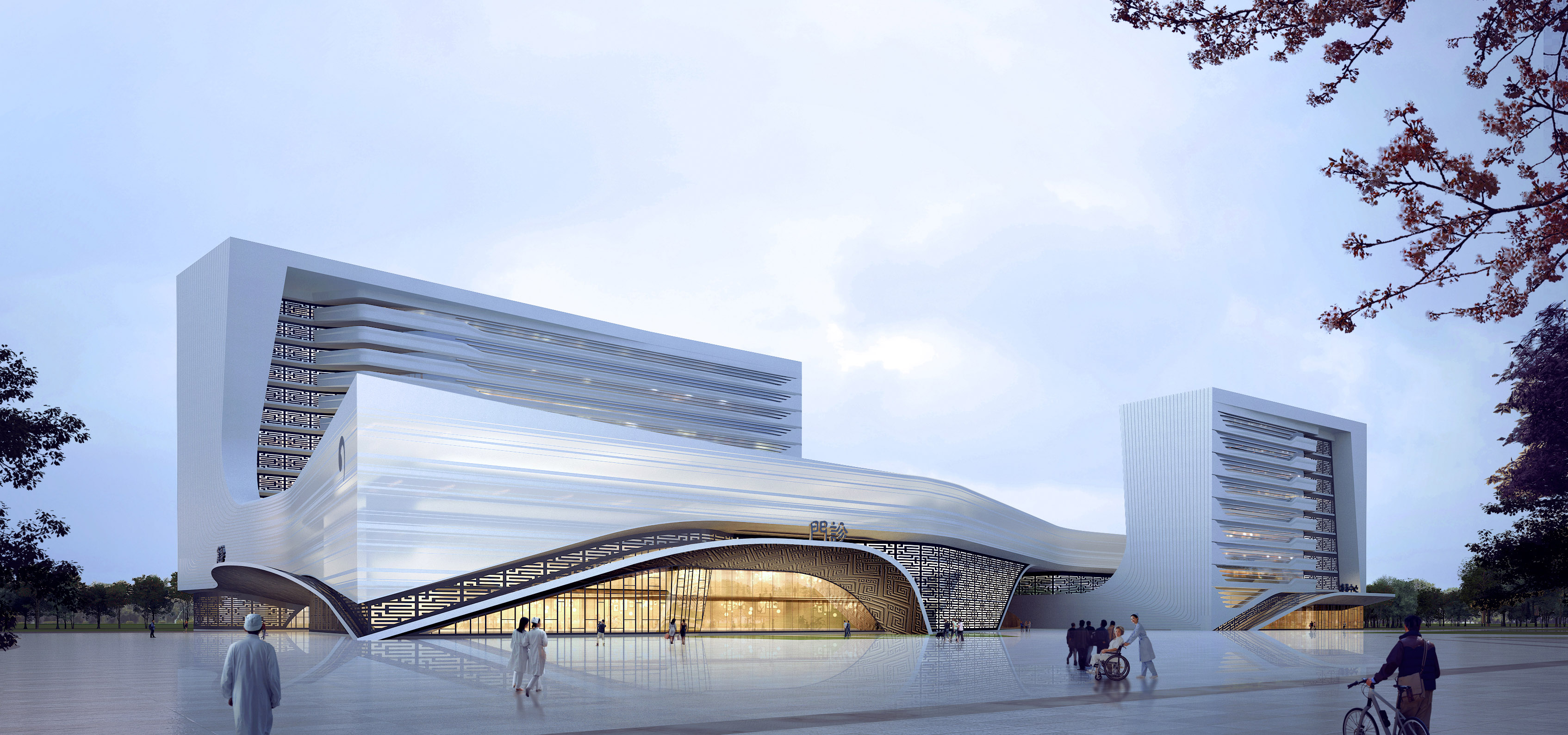 中醫醫院的建筑空間形態力求打破傳統中醫醫院呆板拘謹的新中式立面設計手法,形成一種面向未來、簡約時尚、清新靚麗、韻味獨具的設計風格,表皮通過富有韻律的橫向線條和精細純凈的白色調打造特色鮮明、動感十足的城市建筑形象。建筑群組連續統一,變化巧妙,也體現出中華傳統文化融會貫通、平衡自然的哲學智慧。