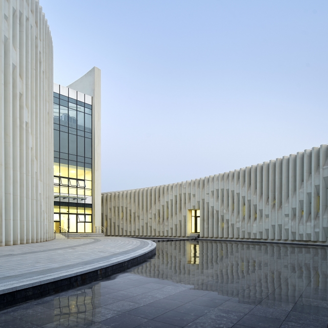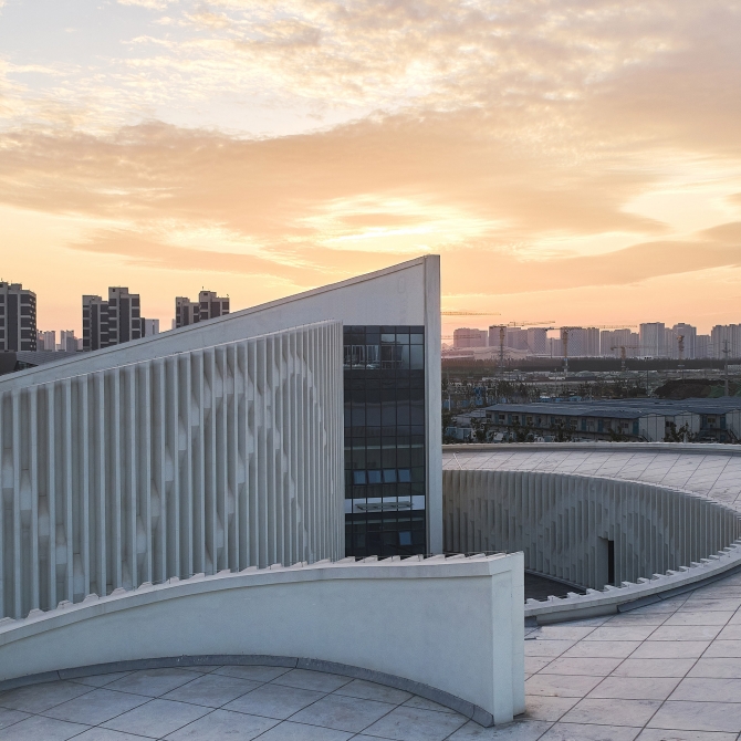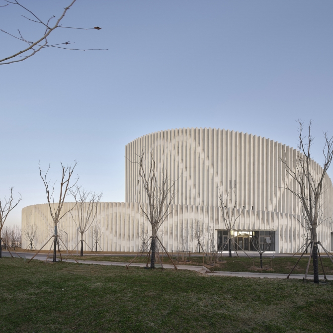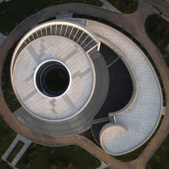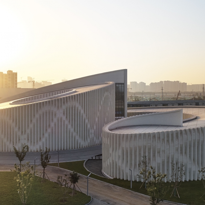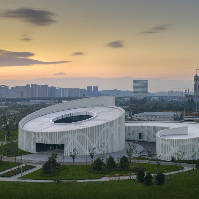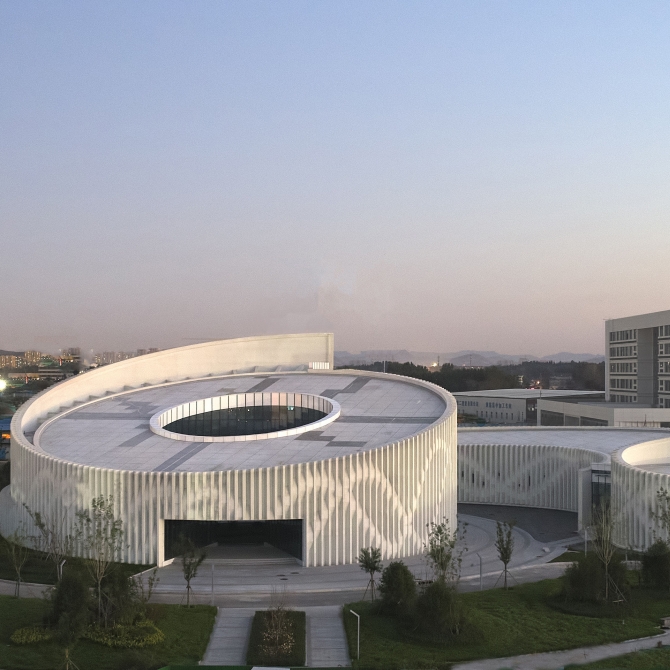 山東第一醫科大學醫學博物館呈現一種簡單、靜謐,形式內向而又富有活力和動感的建筑意向。它歡迎人們進入、感受生命的神奇。高低起伏、螺旋向上的層次感帶來豐富的空間感受,同時這種向上的狀態似乎在傳達生命積極向上的姿態、講述生命的力量。同時,曲線的建筑姿態呈現一種柔美的空間形態,與螺旋向上的建筑立面相結合。我們希望傳達的是生命的柔與剛、靜與動、矛盾與和諧。