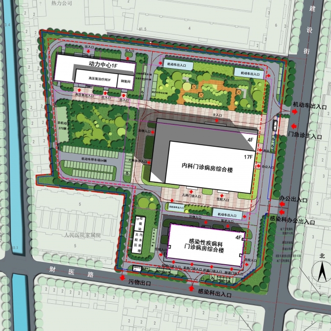北院區(qū)用地面積約3萬(wàn)平米,總建筑面積8.9萬(wàn)平米,總床位數(shù)400床。總體規(guī)劃將感染樓設(shè)于用地東南側(cè),獨(dú)立一區(qū),疫情時(shí)可封閉管理。北院區(qū)分為兩期建設(shè),一期于用地東側(cè)設(shè)內(nèi)科門診住院綜合樓,于西北角設(shè)高壓氧艙及動(dòng)力中心,西南側(cè)設(shè)污水處理站及垃圾站;遠(yuǎn)期于西側(cè)建設(shè)康復(fù)腫瘤綜合樓。