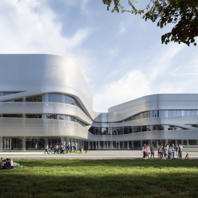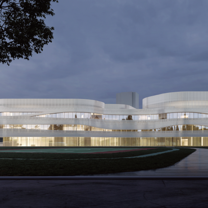 科技文體中心以體量分散,曲線流動的建筑形態與濱江商務區整體的建筑風格相協調,同時為商務區注入新的活力。建筑立面以水平向展開,圓潤的輪廓以及交錯流動、充滿韻律感的曲線賦予文體中心活潑、動感的建筑形象。水平向的曲線為文體中心帶來了不斷變化的空間形式,使建筑在不同的視角呈現出不同的面貌。立面材質選用穿孔鋁板幕墻與玻璃幕墻的組合,營造出文體中心動感且充滿未來感的氣質。