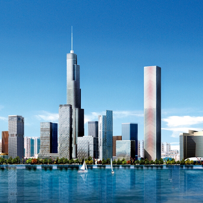 2.天際線控制設計為“一主二次”即一個主峰建筑和兩個次峰建筑,充分考慮到南北和東西兩個方向坐標上的高程關系,營造疏密有致,高低錯落的響螺灣外省市商務區天際線。