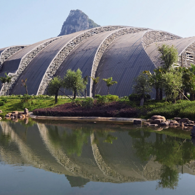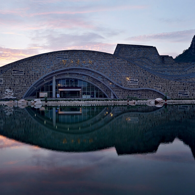 奇石館的空間形體通過拓撲變換和分形幾何的無規自相似與自仿射的變化,曲-水的典型特征,折-山的典型特征在一個形體的不斷變化中和諧統一在一起,具有豐富驚奇的視覺效果。柳州奇石館與自然環境渾然天成,銳意推陳出新,傳承中國源遠流長的山水文化。