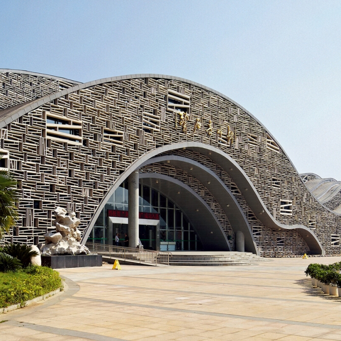 奇石館形體猶如奇峰或奇石變化,立面之上的柵格則脫胎于大地、山體以及巖石表面的紋路和肌理,為整個展覽館增添了獨特的石之韻味。在立面設計中運用計算機參數化方式,將柵格由四種模數制式的單元所構成,單元全部由同一圖案生成。