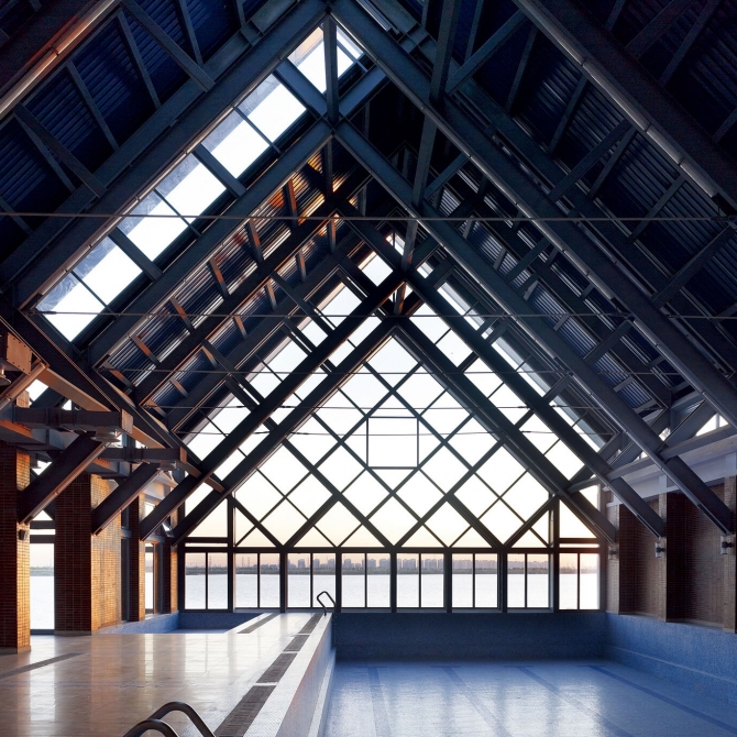 西翼游泳館直落湖中,落地大窗可把東麗湖的落日余暉納入館內(nèi),泳池成了湖面空間的延續(xù)。建筑風格與住宅的英式TUDOR風格相協(xié)調(diào),主體采用紅磚,搭配壓頂和過梁組成的暖黃色的橫線條,局部飾以米色石材門廊,典雅、穩(wěn)重、細部豐富考究。