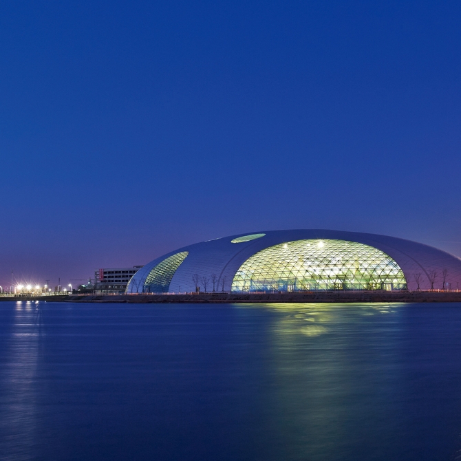 設計實現了把所有水上游樂及服務設施的主要功能空間置于一個完整的建筑體量內,又做到干區和濕區明確分隔的理想追求。渾然一體的橢圓形半球體造型,平地而升,宛若自水中浮起;結構體系提采用了新型復合空間網格鋼結構,即弦支桁架拱-單層網殼結構體系,在結構正交兩個方向各布置兩道弦支拱桁架,拱桁架支承在大體積混凝土承臺上,單層網殼支承于混凝土環梁和弦支拱桁架上,環梁支承在下部承臺上,八個拱腳之間設置井字形四道拉索。