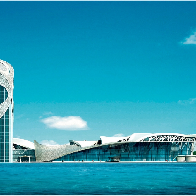 鳳羽般的論壇建筑與“龍頭島”的整體自然環(huán)境融合在一起,島上利用中水回用,雨水收集,清潔能源等手段實現(xiàn)島上自身的循環(huán)和平衡,讓“龍頭島”成為展示生態(tài)技術(shù)的一個封閉單元。