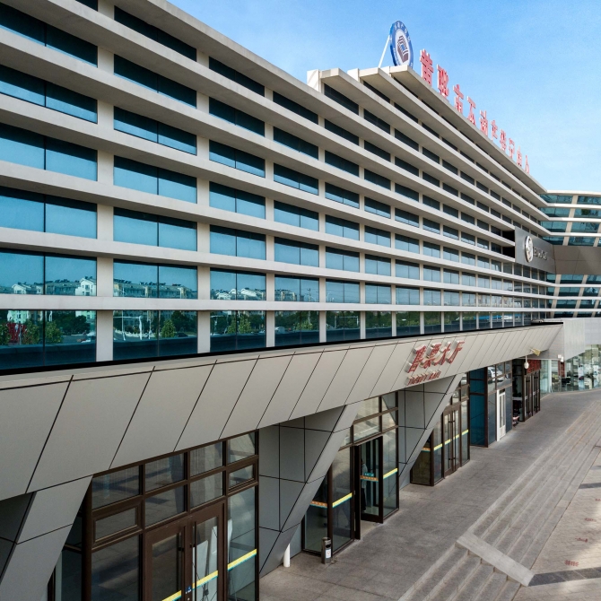 建筑體量沿昌驊大街和石港路充分展開,取得最大的城市視角和標志性。單體造型以“乘風破浪會有時,直掛云帆濟滄海”為主題,在道路的交叉口利用金屬遮陽百葉進行“柔化處理”,比喻奔騰不息的大海;以鋁板幕墻為主基調的外墻向外傾斜而出,配以晶瑩剔透的玻璃幕墻,比喻劈波斬浪,奮勇爭先的大小船只“百舸爭游”。局部升高的柱列通過拉索與主體相聯,使“揚帆起航”的主題更加生動,充滿動感的造型借以隱喻黃驊市厚積薄發的潛在動力及城市地域特色。