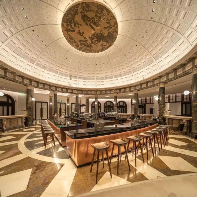 這個新的“網紅打卡地”,位于天津和平路與濱江道交匯處的一角。從外觀上看,這是一座西洋古典式建筑,建成于1922年,已經有近百年的歷史,渾身散發著濃郁的歷史氣息。室內穹頂下的大理石柱、錢幣石刻、柜臺石雕,都讓人感受到撲面而來的歷史厚重感。