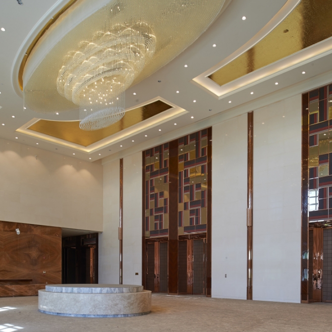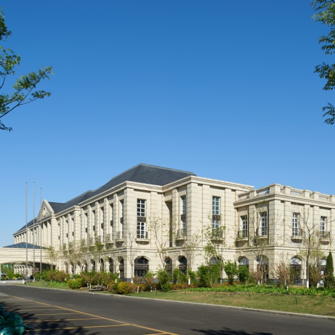 附屬用房呼應天津的文脈特征,結合紅酒莊園建筑的特色,采用傳統歐式建筑語言,首層采用拱券和券心石的開窗元素,二層開窗使用窗套和帶有花紋的鋁板裝飾,頂部為坡屋頂和局部平屋頂相結合的建筑形式。外裝修材料采用米黃色石材搭配古銅色鋁板,屋頂采用板石瓦屋面。