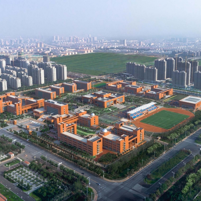 章丘四中新校區設計考慮利用建筑構件進行連接,形成幾個連續的建筑群體。
