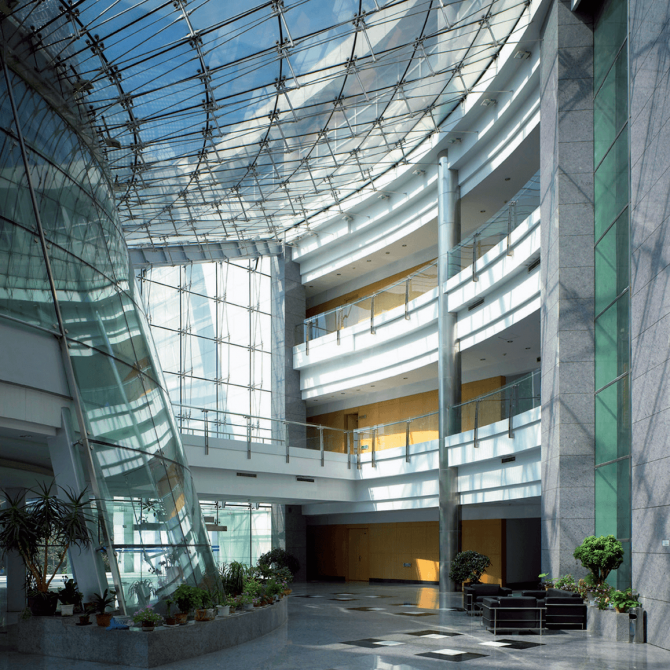 該實驗室主要由合成實驗部、基礎實驗部及辦公室三部分組成。在平面布局中將合成部與基礎實驗部這兩大區域分置兩翼,辦公室設在南側,中央為交通廳,人員流線方便快捷。整座建筑除部分辦公用房之外,主要為各種實驗室及客座教授專用科研用房,同時設置有各種設備用房。