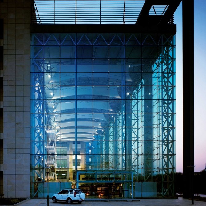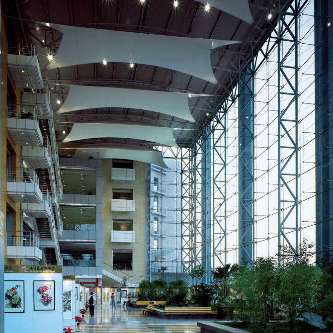 鋼結構的四季大廳讓建筑室內外的空間充分的融和在一起,頂部的通透鋼架使建筑更加具有時代氣息和空間力量感。