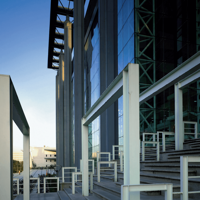 該工程位于吉林大學內,為六層高圖書館建筑。在內部空間設有一個通高的中庭,配以室內綠化,觀光樓梯,形成半開放式的現代閱覽空間。在吉林大學校園中,校圖書館是最具公共性的校園建筑,在設計中利用單純的體量和強有力的大面積虛實墻面對比,形成該建筑明確的標志性和中心性。