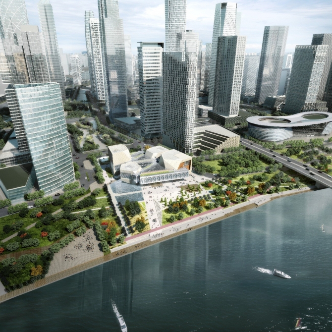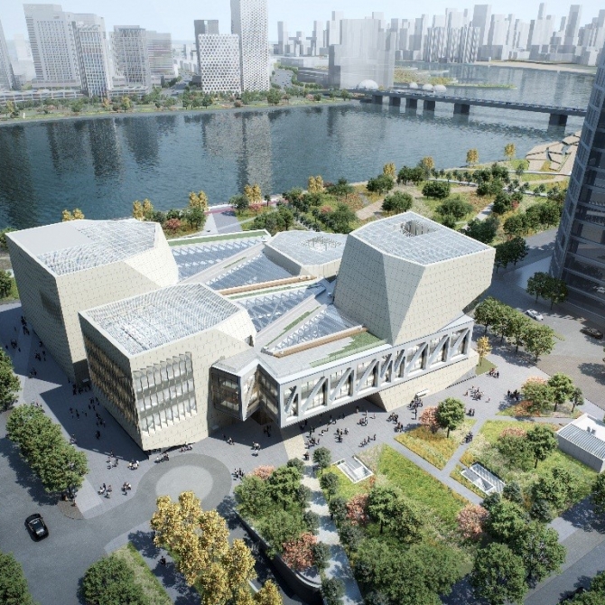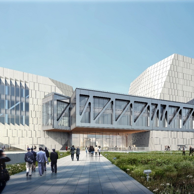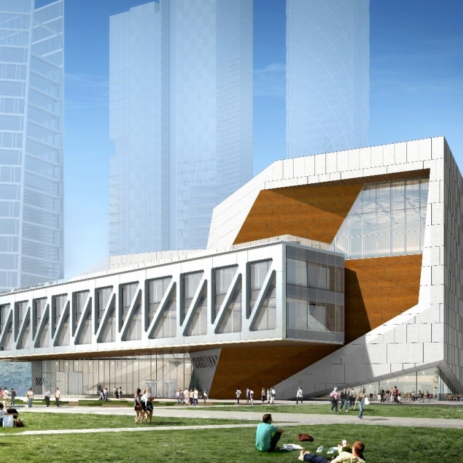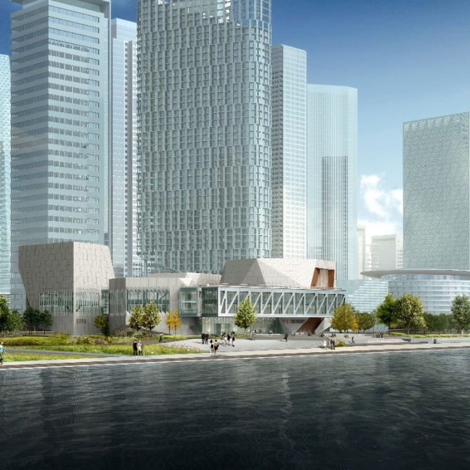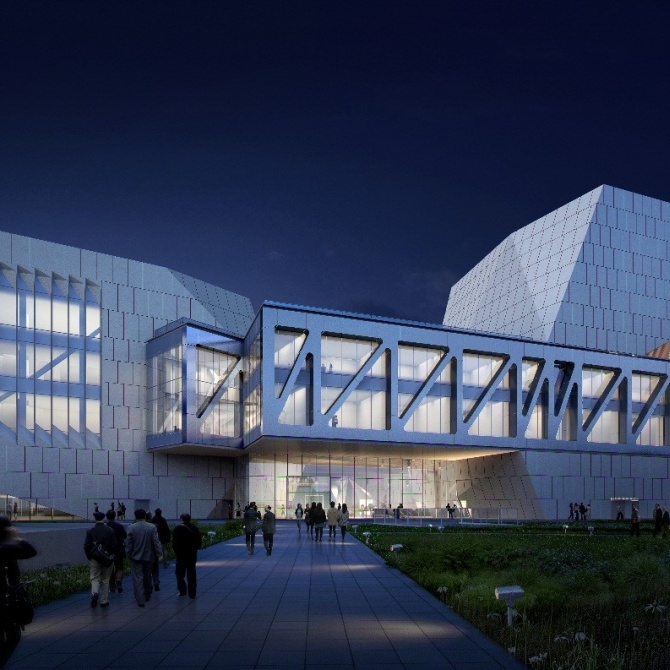 項目空間高大,設有700座劇場、黑盒子劇場各一個,訓練大廳以及一個頂部為玻璃的四季中廳。地下為框架結構,地上鋼為結構,外圍為全幕墻。