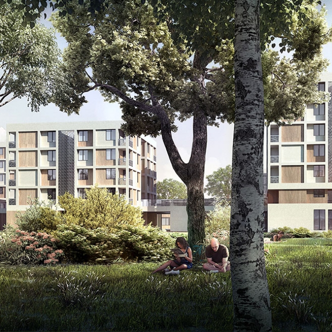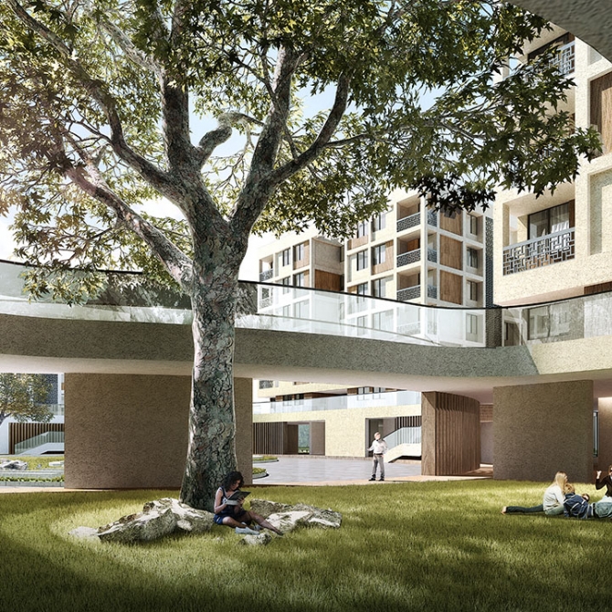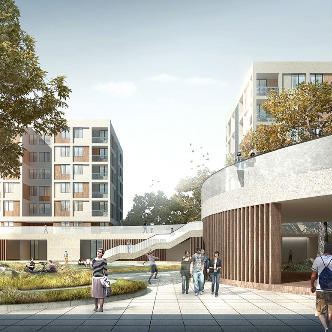 項目位于天津市西青區天津師范大學新校區內,總建筑面積12500平方米,滿足380位留學生入住。本案位于校園北側,其主要人流來自南側教學區和生活區。廣場出入口處設接待中心,醒目便捷。廣場內部實行人車分流,僅允許行人和非機動車進入,行人亦可通過首層架空灰空間到達校園主環路及校園濕地景觀。優美弧線的室外觀景平臺,宛如一條紐帶將錯落有致的宿舍有機聯系到一起,內側形成一個半圍合的景觀庭院。本案采用白色和仿木紋水泥纖維板作為建筑外檐材料。通過簡潔的白色骨架,木色和白色相間的建筑墻面的設計元素和手法,體現中式匠心獨運的文化內涵。