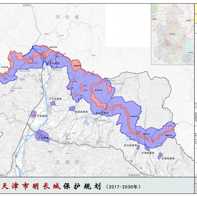 天津明長(zhǎng)城保護(hù)規(guī)劃的編制是在《全國(guó)長(zhǎng)城保護(hù)規(guī)劃編制導(dǎo)則》指導(dǎo)下完成的省段長(zhǎng)城保護(hù)規(guī)劃。在研究層面,搜集并整理了大量的關(guān)于天津市明長(zhǎng)城及相關(guān)漕運(yùn)、古代陸路交通、天津市、薊州區(qū)的發(fā)展史資料,評(píng)估挖掘長(zhǎng)城所蘊(yùn)含的價(jià)值。新技術(shù)手段應(yīng)用方面,利用無(wú)人航拍飛機(jī)技術(shù)與儀器,進(jìn)行低空攝影,彌補(bǔ)長(zhǎng)城資源環(huán)境調(diào)查的空白,提高調(diào)查質(zhì)量。