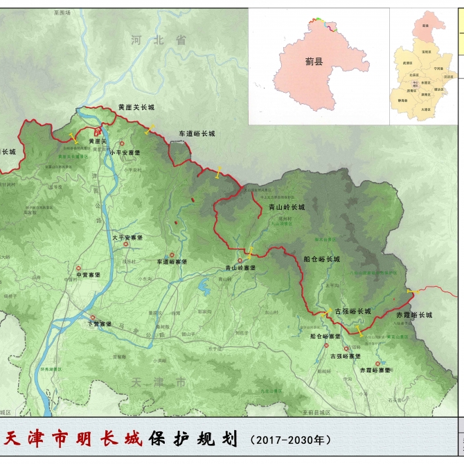 天津市境內(nèi)明長(zhǎng)城全長(zhǎng)40.28公里,全國(guó)長(zhǎng)城分布最短的省市,屬地一脈相承,集中分布于天津市薊州區(qū)下?tīng)I(yíng)鎮(zhèn)北部山區(qū)。天津市明長(zhǎng)城所在薊州鎮(zhèn)是京畿所在,長(zhǎng)城建筑遺存豐富,且防御體系完善,在長(zhǎng)城所在城市中富有特點(diǎn),是明長(zhǎng)城防御體系一個(gè)具體而微的代表。