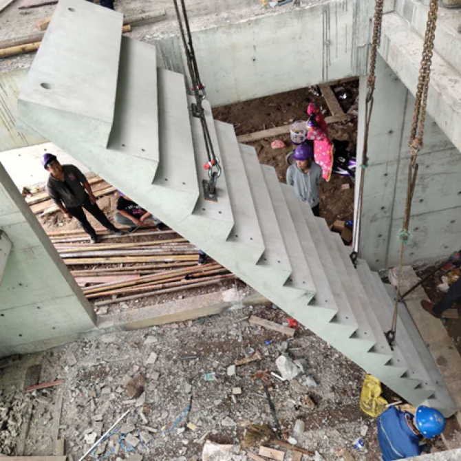 預制樓梯機械化施工程度更高,預制樓梯在工廠整體為清水混凝土澆筑,外表肌理異常細密,無需再做裝飾面。預制樓梯宜通過鋼筋直錨入疊合樓板現澆層部位,與主體形成可靠連接。