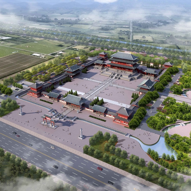 項(xiàng)目由李氏祖庭建筑組群與李氏宗親林組成,文化園整體布局遵循中國(guó)傳統(tǒng)文化中的“禮樂(lè)”哲學(xué)觀(guān),同時(shí)建筑組群既符合傳統(tǒng)宗祠的祭祀型空間體系,又能滿(mǎn)足現(xiàn)代場(chǎng)所的使用需求。在空間設(shè)計(jì)上,無(wú)論是建筑布局還是建筑體量的控制,均參尋了中國(guó)傳統(tǒng)設(shè)計(jì)方法中“百尺為形,千尺為勢(shì)”的形勢(shì)學(xué)概念。在建筑形態(tài)上,以濃重的唐代風(fēng)格加以詮釋。高 30 米的主體建筑突破了現(xiàn)代高層建筑限定,雖增加了設(shè)計(jì)難度,但在效果上實(shí)現(xiàn)了唐代建筑風(fēng)格雄偉恢弘的藝術(shù)表現(xiàn)力。