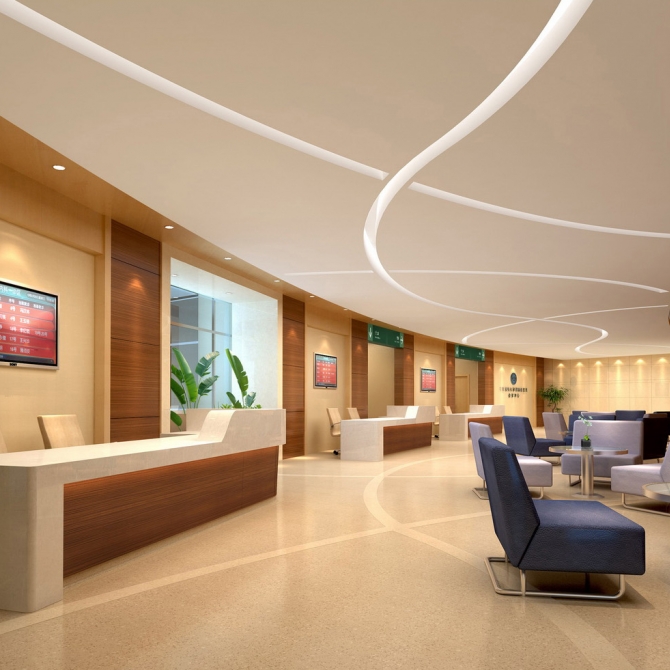 醫院由于人員比較密集,是大人流量的公共空間,因此設計上也必須與這個特點相適應,以明快的色調和采光效果,確保空間的流暢和交通便捷,使病人用最快的速度到達他要去的科室。因此,明快的設計風格可以避免不必要的視覺干擾,提高空間效率,確保醫療功能的主導地位。
