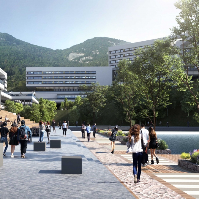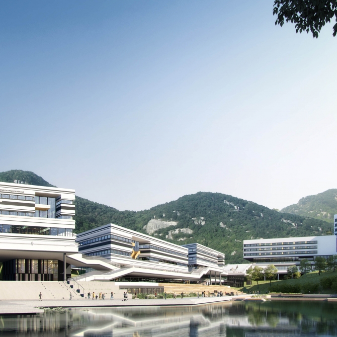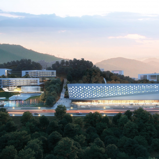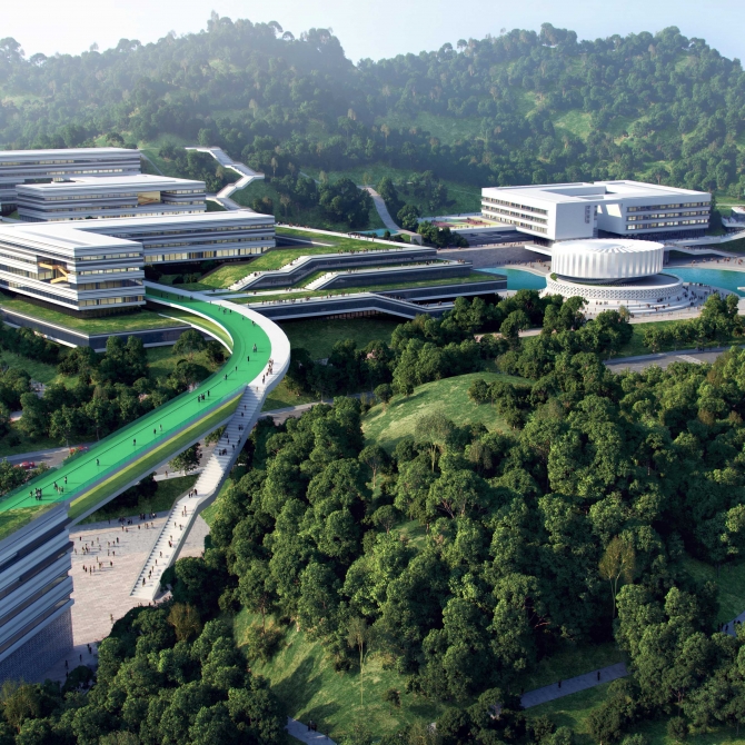 北側(cè)的教學(xué)生活區(qū)為學(xué)校的主體功能空間,建設(shè)用地沿外環(huán)路橫向展開(kāi),“一核兩園 展翼齊飛”的規(guī)劃格局,將使這里成為電力科技知識(shí)的殿堂,也成為學(xué)生美好校園生活的空間載體。“一核”, 為學(xué)術(shù)共享核,“工匠精神”大講堂及圖文中心位于校園中央,“能量環(huán)”的設(shè)計(jì)理念助力它成為整個(gè)校園的精神高地和學(xué)術(shù)燈塔。綜合實(shí)訓(xùn)、基礎(chǔ)教學(xué)、公共創(chuàng)新實(shí)驗(yàn)中心在大講堂西側(cè)沿山體帶狀展開(kāi)。行政接待中心及電力科技博物館位于入口東側(cè)。整個(gè)學(xué)術(shù)共享核心建筑群結(jié)合山體臺(tái)地拾級(jí)而上,烘托出巍巍學(xué)府氣息。“兩園”為東西學(xué)生生活園,“西園”是由電力工程學(xué)院的學(xué)生生活、專業(yè)實(shí)訓(xùn)、餐飲服務(wù)以及主體育場(chǎng)和學(xué)生文體活動(dòng)中心共同組成,圍繞自然山谷的山水環(huán)境,創(chuàng)造出美好而有趣的山地校園生活空間。“東園”是由動(dòng)力、信息、經(jīng)管等綜合學(xué)科組團(tuán)的學(xué)生生活、專業(yè)實(shí)訓(xùn)以及輔體育場(chǎng)共同組成。東西兩園分別連接南側(cè)的校企互動(dòng)建筑群與公共教學(xué)實(shí)訓(xùn)區(qū),形成適合山地校園地形特征,經(jīng)濟(jì)合理,并且符合動(dòng)態(tài)生長(zhǎng)、分期建設(shè)策略的帶狀展開(kāi)的校園建筑群,創(chuàng)造出“一核兩園 展翼齊飛”的整體校園空間態(tài)勢(shì)。